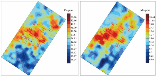 The main ore-forming elements in the Zhunsujihua working area are Mo and Cu. The Mo content of the fine-grained soil prospecting method ranges from 0.93 to 5.69 ppm, with a median value of 1.77 ppm and an average value of 1.97 ppm, which is significantly higher than that in the semi-arid grassland coverage area (median value is 0.75 ppm and average value is 0.99 ppm) [31]. The Cu content ranges from 13.1 to 43.1 ppm, with a median value of 23.8 ppm and an average value of 24.9 ppm, which is also significantly higher than that in the semi-arid grassland coverage area (median value of 12.1 ppm and average value of 15.1 ppm) [31].