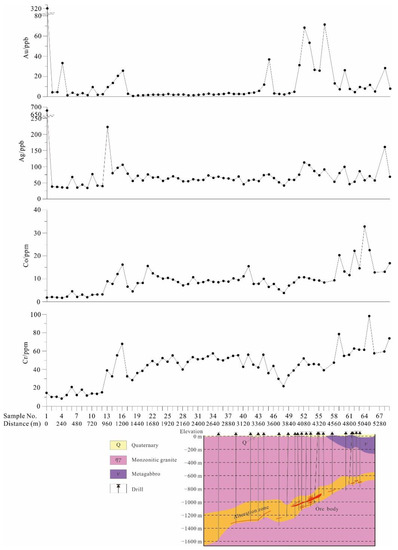 Figure 11 shows the line chart of Au, Ag, Co, and Cr across the concealed mineralized zone and into unknown areas (the survey line is marked with a blue line in Figure 4). The Au content above the ore body (Sample No. 51–57, 4000–4480 m) is 25.7–71.4 ppb, which is 10 to 30 times the Au content of the background area (about 2 ppb, Sample No. 18–37, 1360–2880 m). The Au distribution is highest above the ore body and lower further away from the ore body. The Ag displays a similar distribution to Au. The content of Co and Cr is highest above the basic rock mass and lower further away from the basic rock mass. These results demonstrate that using the fine fraction of soil can indicate Au mineralization and geological background in alluvium soil covered areas.