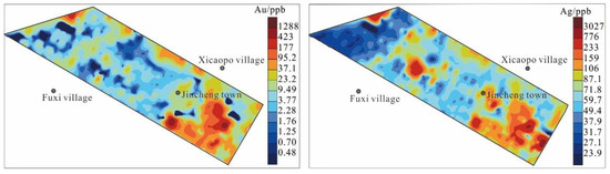 The Au and Ag geochemical maps (Figure 12) measured by the fine-grained soil prospecting method in the Qujia experimental area are very similar. The anomalous areas (orange to deep red in Figure 12) are mainly distributed in the southeast of the experimental area, corresponding to deep ore bodies [26]. The anomaly area is large and of high intensity. The anomaly is not closed in the test area and extends to the southwest, consistent with the neighboring Zhaoxian exploration area [35]. The anomaly also appears in the northwest of the test area with high intensity, thus not enclosed inside the test area. The test results show that the surface geochemical anomalies correspond to known ore bodies and new anomalies in unknown areas, confirming that the fine-grained soil prospecting method can effectively indicate deep concealed ore bodies and be used as an effective method for finding deposits in the alluvial soil covered terrain.