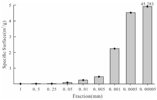 After the active metal elements migrate from deep ore bodies to the surface, they will inevitably occur in the surface medium in various forms, including ionic compounds, complexes, soluble salts, colloids, elemental particles, and alloy mineral particles [7,51]. No matter what form it exists in, active metal elements are often positively charged, so they are readily adsorbed by negatively charged clay minerals and/or iron-manganese oxides. Clay minerals are the most important secondary minerals in the soil, mainly secondary crystalline layered silicate, including kaolin, montmorillonite, illite, chlorite, hydromica, and vermiculite. The colloidal surface of clay minerals is charged and has a large specific surface area [52], so it is an ideal carrier for the active metal elements, and clay minerals mainly exist in the fine-grained soil components. In addition, iron and manganese oxides are abundant in surface soil, and iron and manganese oxide films often cover the surface of mineral particles. The specific surface area of iron-manganese oxide in the soil increases exponentially with the decrease of the sample size (Figure 13). The larger the specific surface area, the stronger its ability to adsorb active metal elements. Therefore, the physical separation of the soil’s fine particle components can effectively enrich the active metal elements. For example, in the arid Gobi Desert covered areas, as the soil particle size decreases, elements such as Al2O3, Fe2O3, and Mn, representing clay minerals and iron-manganese oxides, increase. Simultaneously, the content of ore-forming elements also increases (Figure 14). It can be seen from the above that fine-grained substances are natural “trapping wells” for active metal elements because of their strong adsorption and exchangeability properties.