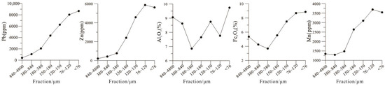 Pb, Zn, Al2O3, Fe2O3, and Mn line chart in different size fractions of soil in the arid Gobi Desert covered areas.