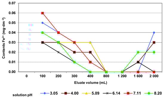 Contents of Fe2+ ions in successive portions of the collected eluate depending on the pH of the initial leaching solution.