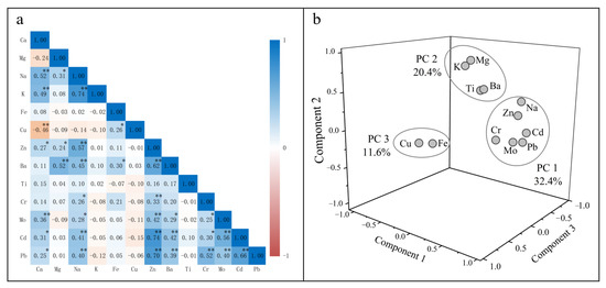 Correlation analysis (a) and principal component analysis (b) of the chemical components of kidney stones. ** p < 0.01; * p < 0.05.