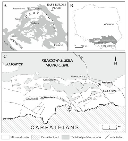 The study area is located near Krakow, in the Polish part of the Carpathian Foredeep, and was formed in the Miocene as a peripheral foreland basin [14]. It constituted the northernmost part of the epicontinental Central Paratethys Sea (Figure 1A), which separated from the remnants of the northern Tethys Ocean in the Oligocene (~34 Ma) [15,16]. The Central Paratethys, a chain of interconnected epicontinental basins in which water was freely exchanged, existed in various configurations from the early Oligocene to the Late Miocene [17]. Episodically, marine hydrological connections between the different basins were reduced due to complex tectonic and/or glacio-eustatic processes [18]. During the Middle Miocene (Langhian), tectonic movements, associated with the folding and uplift of the Carpathians, led to marine transgression into the adjacent areas. Marine deposits of sandstones, mudstones, and clays with thicknesses ranging from tens to hundreds of meters were formed. At the same time, intense volcanism took place in the Carpathian area, which left behind levels of tuffs and tuffites [19,20,21,22]. Miocene profiles of the Langhian (early Badenian) sediments have been undisturbed, and only in a narrow zone extending along the Carpathian overthrust are they folded. The mineralization described in this paper is derived from this sub-evaporite series (Figure 2), the age of which has been determined as Langhian (Early Badenian) based on microfaunal studies [23]. The drilling profiles described in this paper are located to the west of Krakow (Figure 1C), where the width of the Carpathian Foredeep is only a few kilometers (5–10 km). The basement rocks of the Miocene sediments occur there at relatively shallow depths. That elevation of the Paleozoic and Mesozoic terrain (“Krakow Bolt”) has partially restricted the free exchange of water between the two parts of the basin [24]. A sequence of grabens and dislocation zones have been observed within the consolidated basement [25]. Also nearby is the 500 m wide Krakow–Lubliniec Fault Zone (KLFZ), which cuts and dislocates all of the Precambrian and Paleozoic rock series (Figure 1C). Much of this dislocation resurfaced in the Neogene time, during the remodeling of the region. Parallel faults formed, creating newly separated grabens (e.g., the Krzeszowice Graben).