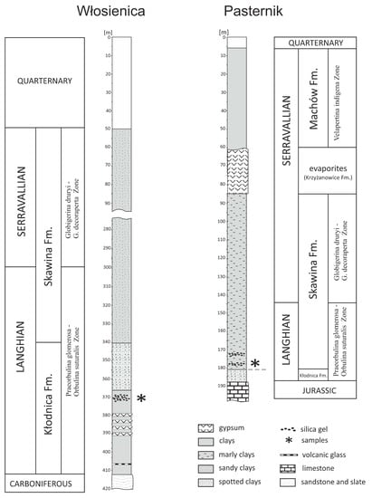 - Bukowski, K.; Sant, K.; Pilarz, M.; Kuiper, K.; Garecka, M. Radioisotopic age and biostratigraphic position of a lower Badenian tuffite from the western Polish Carpathian Foredeep Basin (Cieszyn area). Geol. Q. 2018, 62, 303–318. [Google Scholar]