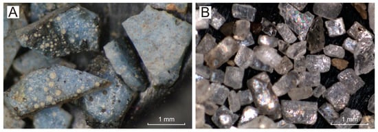 Similar blue solidified silica gel was found in larger amounts in the Włosienica well, located a few kilometers east of Oświęcim (Figure 1). In the drilling profile, Carboniferous sandstones and shales occur in the bedrock (Figure 2). The lithological profile of the Miocene is formed by the Kłodnica and Skawina Formations. Evaporites and younger sediments of the Machów Fm were not observed, probably due to erosion. At a depth of 370 m, a significant accumulation of blue-colored solidified silica gel (with antimony mineralization) was discovered in light green, plastic and layered clays (Figure 2). Within the same residuum sample, a significant accumulation of authigenic, transparent anhydrite crystals, several millimeters in size, were found (Figure 3B).