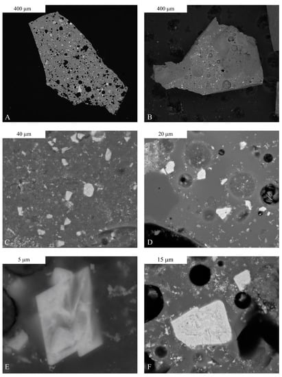 BSE images of the studied Sb minerals scattered in solidificated silica; (A–D)-contrasting bright Sb minerals and visible oval traces of degassing; (E)-small idiomorphic crystal of brizziite in solidificated matrix; (F)-oval shape of roméite crystal with progressive alterations.