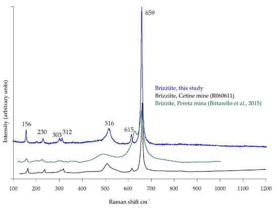 The Raman spectrum of brizziite and its comparison with the spectra of the brizziite from two the Italian mines (Cetine (the type locality) and Pereta) [RRUFF database, 2,27] are shown in Figure 5. In the spectrum from the present study, two bands at~659 cm−1 (strong) and 615 cm−1 (medium) are similar to the spectra described by Frost [27]; they are attributed to the Sb-O (ν1) symmetric stretching mode. The weak band at 516 cm−1 is ascribed to the Sb-O (ν3) (antisymmetric stretching vibration). It is shifted by several cm−1 towards the lower wave values. Most likely, the band is related to an admixture with roméite, for which the strongest band is 516 cm−1. The presence of minimal substitutions of Ca for Na in the brizziite is also possible. The presence of calcium in the structure of brizziite, with a higher atomic weight than that of Na, shifts the band toward higher wave values. The Raman bands observed at 230, 303, and 312 cm−1 are bound to the O-Sb-O bending modes [27].