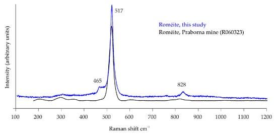 The Raman spectrum of roméite (Figure 6) shows the bands which are consistent with the literature data. It should be stressed that roméite is characterized by a wide range of substitutions in the structure, so shifts of some bands are typical of this group of pyrochlores. According to Bahfenne and Frost [28], a strong band at ∼517 cm−1 for roméite is assigned to the Sb-O (ν1) symmetric stretching mode, while the medium band at 465 cm−1 is assigned to the Sb-O (ν3) antisymmetric stretching mode. The weak band at ca. 300 cm−1 is assigned to the O-Sb-O bending mode. Another medium band has been observed at 828 cm−1. Similar spectral features have also been noted in the roméite samples from Switzerland (791 and 829 cm−1), and Italy (Praborna Mine, 791 and 811 cm−1 and Cetine, 791 and 819 cm−1) [28].