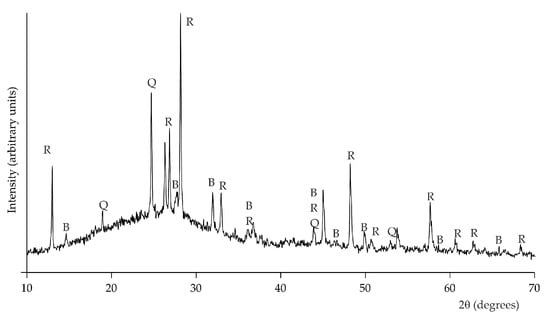 XRD patterns of the solidificated silica; visible reflections: brizziite (B), roméite (R) and quartz (Q) (this study).
