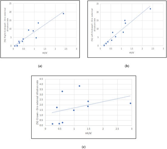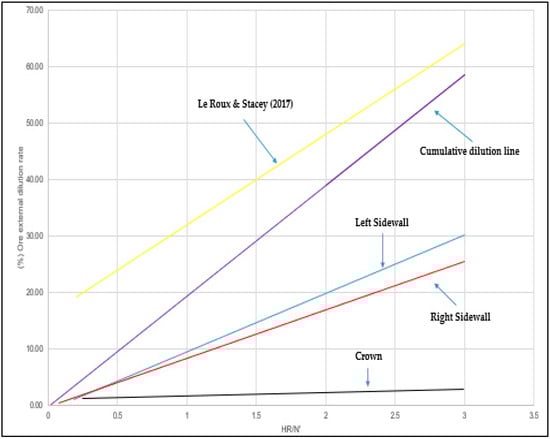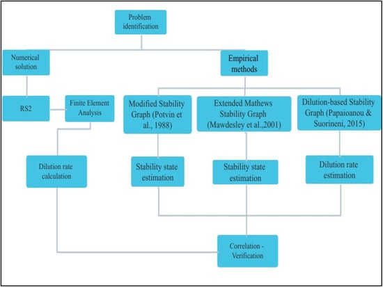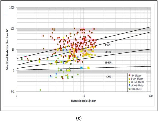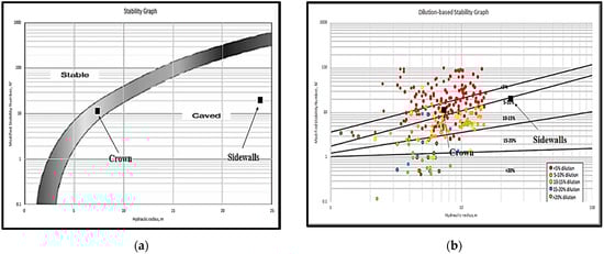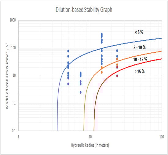 - Clark, L.M.; Pakalnis, R.C. An empirical approach for estimating unplanned dilutionfrom open stope hangingwalls and footwalls. In Proceedings of the 99th Annual General Meeting; [CD-ROM]; Canadian Institute of Mining, Metallurgy and Petroleum: Vancouver, BC, Canada, 1997. [Google Scholar]