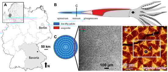 We used a polished 2 cm × 2-cm section of a Megateuthis rostrum that shows the biphasic microstructure [19]. The specimen comes from the Middle Jurassic of southern Germany (Latitude: 49.4520/Longitude 11.0767, Figure 1A). During deposition, the area was located at about 34° N in a warm, fully marine epicontinental sea, about 60 to 80 km from the coastline, with water depths of up to 70 m [22].