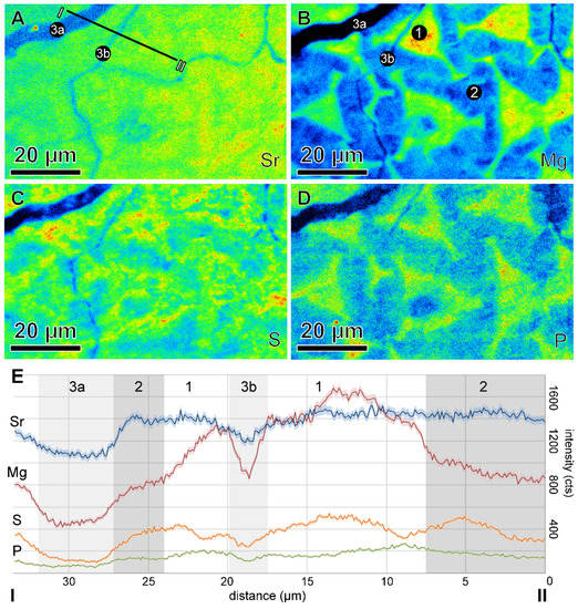 Electron probe microanalysis (EPMA), confocal Raman microscopy (CRM), backscattered electron microscopy (BSE), and secondary ion mass spectrometry (SIMS) were done on the polished section to investigate differences between CP1 and CP2. EPMA was done on a 10–15-nm carbon-coated sample surface using a Cameca SXFiveFE (central microanalytical laboratories, Ruhr-Universität Bochum). For quantitative analysis, we used a defocussed beam (5 µm, acceleration voltage 15 kV, probe current 10 nA), and qualitative X-ray mapping was on a 10-nm-thick gold-coated surface using a focused beam (acceleration voltage 8 kV, probe current 400 nA). CRM was done using a WITec alpha 300 R confocal Raman microscope (Alfred Wegener Institut Helmholtz-Zentrum für Polar- und Meeresforschung, Section Marine BioGeoSciences) with an excitation wavelength of 488 nm, a spectrometer grating of 600/mm, and 500-nm blaze. The Cameca IMS-1280 (WiscSIMS, Department of Geoscience, University of Wisconsin) produces high-precision (0.3‰, 2SD) analyses of δ18O in carbonates with 10-µm pit diameter [23,24]. Analysis was done using a caesium ion beam with a standard-sample-standard bracketing technique, using two brackets of four analyses of UWC-3 (δ18O = −17.87‰, Vienna Pee Dee Belemnite, VPDB, [25].