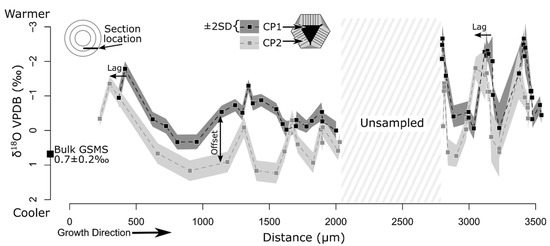 Alternatively, reduction of CA due to less exposed enzyme-hosting organic membranes or differing secretion rates could limit CO2-H2O system equilibration [43]. Vital effects in mollusks generally cause lower δ18O values and, therefore, cannot explain the observed offset ([45,46], but see [47]). Disequilibrium formation of CP2 and equilibrium secretion of CP1 provide a plausible explanation for the observed δ18O offset and represent a biomineralization chronology.