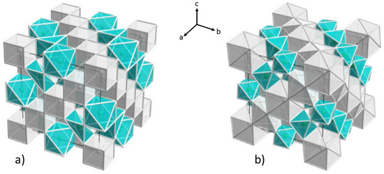 The x parameter usually varies from 3⁄8 = 0.3750 to 5⁄16 = 0.3125. In the first case, A is located at the center of a regular cube and B at the center of a trigonal antiprism. For x = 0.3125, A-site form a trigonal scalenohedron and B-site, in turn, becomes a regular octahedron, sharing vertices with 6 other neighbor octahedrons. These situations are shown in Figure 1.