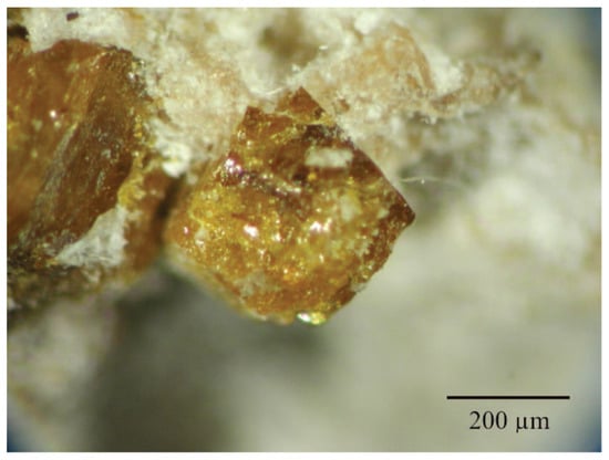 The general formula is Ca2Sb25+O6O [21], and the empirical formula, based in 2 cations in the B-site, is (Ca1.073Fe2+0.338Sb3+0.330Na0.118Pb0.013Mn0.008)∑ = 1.880(Sb5+1.734Ti0.194V0.040Al0.024Sn0.008)∑ = 2.000(O6.682F0.278)∑6.960. Concerning the crystal structure, oxycalcioroméite has cubic unit cell, space group Fdm, with = 10.3042(7) Å, V = 1094.06(13) Å3, Z = 8. Figure 2 shows an image of this mineral.