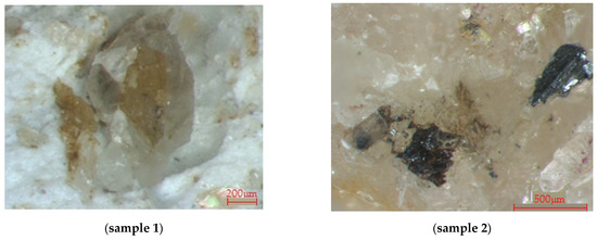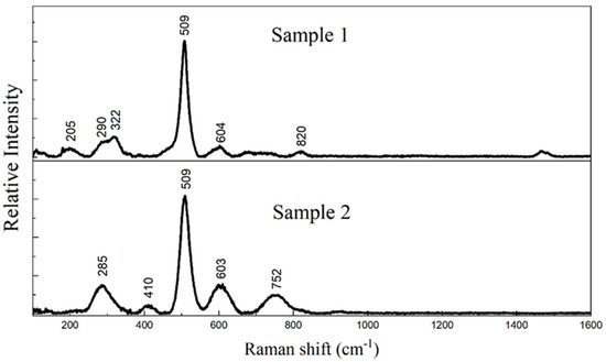 The spectra obtained for the two samples were compared in the RRUFF database, using the software Crystal Sleuth [52]. All spectra exhibited the characteristic bands of the bonds present in roméite-group minerals [24]. The most evident band in the spectra is that corresponding to the stretching of Sb-O bond, visible in the region of 400 to 600 cm−1, for the highest intense peak. In the spectra showed in Figure 8, this band is highlighted as 509 cm−1 for both samples 1 and 2. The figure shows the spectral range from 100 cm−1 to 1600 cm−1, which comprises the characteristic spectrum region of the samples and the bands corresponding to the bending of the O-Sb-O group are in the range from 200 to 400 cm−1 (205, 290 and 322 cm−1 for sample 1 and 285 and 410 cm−1 for sample 2) while the overtones are in the region above 700 cm−1, for instance 820 cm−1 for sample 1 and 752 cm−1 for sample 2 [24,53]. Low intensity Raman bands at 604 cm−1 for sample 1 and at 603 cm−1 for sample 2 are probably assignable to the O–Sb–O antisymmetric stretching vibrations, by comparison to those observed at 669 and 682 cm−1 for the mineral bahianite Al5Sb35+O14(OH)2 [54].