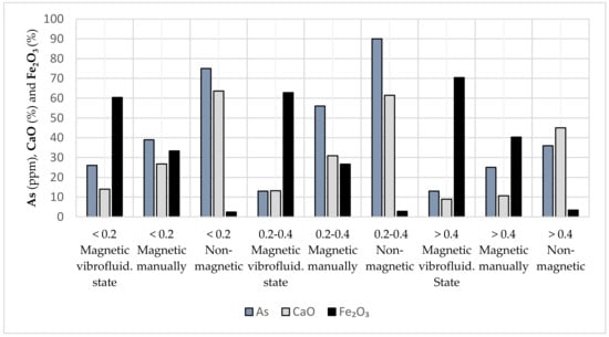 The concentrates originating from the first magnetic separation (in the vibrofluidized state) contain the lowest As and CaO contents while the Fe2O3 percentage is the highest in the case of all particle-size fractions. The second magnetic separation (applied to the residue after the first one) provides the magnetic concentrate with a somewhat lower Fe level, which contains moderately higher concentrations of As and CaO. After magnetic separation, the residues (dominantly composed of CaO and SO3) are enriched in As.