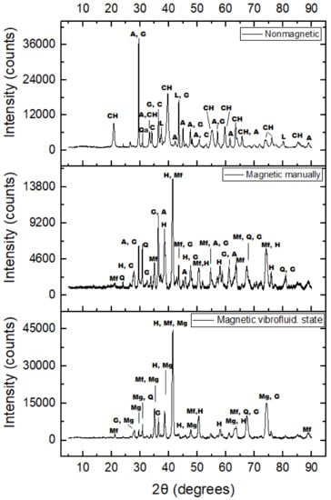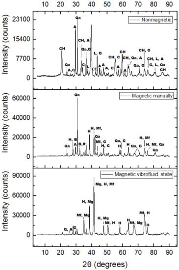 XRD patterns of the magnetic vibrofluid state, magnetic manual, and nonmagnetic fractions of the finest < 0.2 mm (A = Anhydride, B = Bilinite, C = Calcite, CH = Calcium Hydroxide, G = Gehlenite, H = Hematite, L = Lime, Mg = Maghemite, Mf = Magnesioferrite, Q = Quartz, Qa = Quartz alpha, R = Rutile).