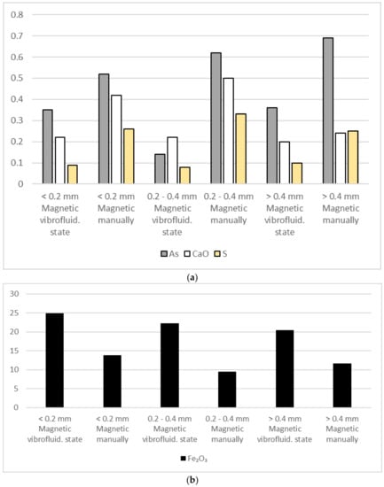 Enrichment factors (calculated according to Equation (1)) are plotted for As, CaO, and S in Figure 4a and Fe2O3 in Figure 4b. The same concentrations of the studied element are shown in the magnetic and non-magnetic fractions. Figure 4 suggests that As and CaO (and S) are strongly depleted in all magnetic concentrates, which is even more pronounced in the first (vibrofluidized) separation. As expected, the Fe2O3 content is always strongly enriched in the first magnetic concentrates and its enrichment in the concentrate originating from the second separation step is somewhat lower.