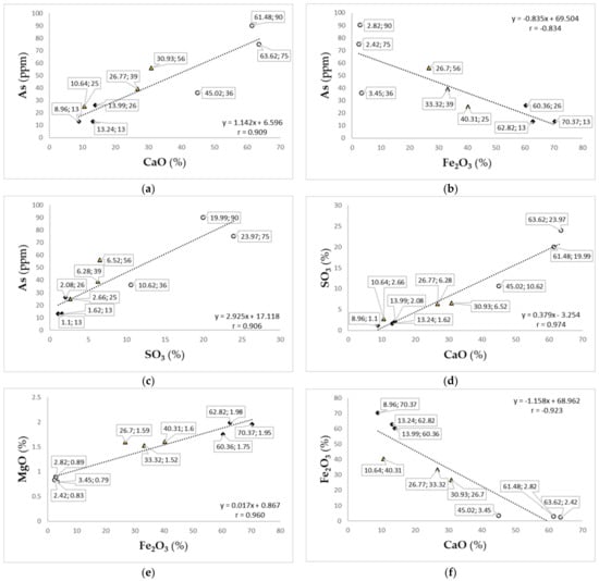 Relationships between the concentrations of (a) As–CaO, (b) As–Fe2O3, (c) As–SO3, (d) SO3–CaO, (e) MgO–Fe2O3, and (f) Fe2O3–CaO (black squares are used for highly magnetic fractions, yellow triangles for less magnetic ones, and circles for non-magnetic residues).