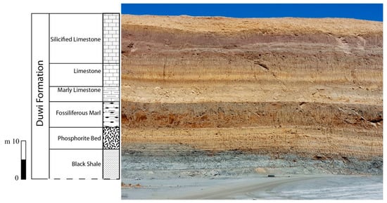 In Egypt, the above time interval is economically important as it contains the main episodes that led to the formation of the black shale and phosphorites of the Duwi Formation [4]. Phosphatic accumulations are associated with organic-rich strata and cherts, and indicate high productive surface waters [1,4]. The province holds the greatest accumulation of phosphorites in geological history, possibly in excess of 70 billion metric tons; the phosphate resources in Egypt alone exceed 3 billion metric tons [5]. These phosphorites represent the late Cretaceous Tethyan phosphorite belt and occupy a vast region that extends from North Africa to the Middle East [6]. In Egypt, black shale deposits are mostly associated with phosphorites deposits, as shown by Troger [7], who stated that the phosphate belt in the Eastern Desert, Nile Valley and Southern Western Desert, contains a huge source of black shale. The above study concluded that black shale is concentrated along many places, among them the Nile Valley in the Esna-Idfu region. Hassan et al. [8] indicated that the black shale of the Duwi and Dakhla formations and the Lower Calcareous shale member of the Esna Formation are characterized by mud bands and pseudomorph of iron-oxides. This resulted from the deposition of oscillating shallow marine conditions in an outer neritic to inner neritic and reducing environment that also contains muddy argillaceous sediments.