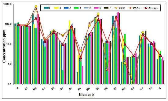 The values of Zr, Cd, Zn, Pb, V, U, Th, and Mo in the studied samples are higher than those in the Upper Continental Crust (UCC) [14] and the Post Archaean Australian Shale (PAAS) [28] (Figure 5).
