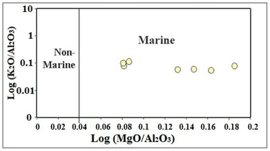 Roaldset [57] concluded that the relationship between K2O/Al2O3 and MgO/Al2O3 can be used to differentiate between marine and non-marine sediments. Applying this relationship (Figure 6) revealed that all studied black shale samples plot in the marine water field, in agreement with Abou El-Anwar and Samy [27] and Abou El-Anwar et al. [51]. Al2O3 is a significant indicator for the extent of detrital influx. The low values of the K2O/Al2O3 ratio (0.07 to 0.09) are attributed to the marked presence of kaolinite. The positive correlation of Al2O3 with TiO2 (r = 0.71) suggests that TiO2 is a necessary trace constituent of clay minerals. The positive correlation (r = 0.57) between Al2O3 and K2O can be explained by the occasional presence of illite, which was not detected by XRD.