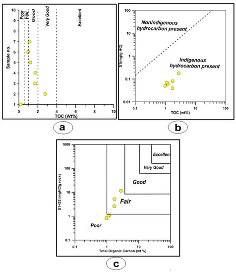 The El Sebaiya samples have total organic carbon (TOC) values ranging from 0.21 to 2.77 wt.%, which indicates poor to good organic content [20] (Table 5 and Figure 7a). The lowest TOC value was recorded in the outcrop layer, owing to the impact of the weathering process. The relationship between TOC wt.% and S1 can determine the origin of hydrocarbons present, whether they are indigenous or non-indigenous [62]. Figure 7b shows that the S1 hydrocarbons in the El Sebaiya samples are indigenous. The hydrocarbon generating potential of a source rock also can be estimated from the relationships between TOC (wt.%) vs. S1 + S2. The El Sebaiya samples have poor to fair hydrocarbon potential according to Dembicki [63] (Figure 7c).