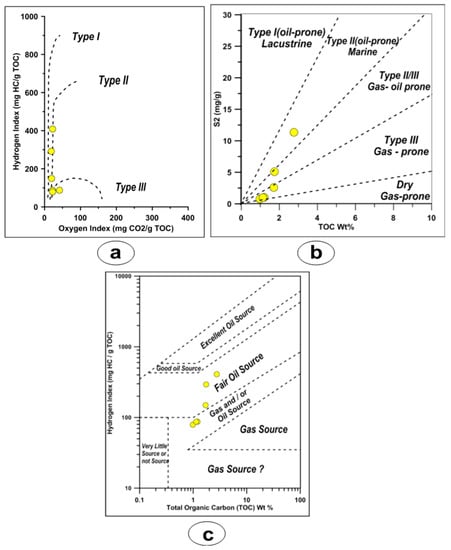 (a) Modified van Krevelen diagram of the El Sebaiya samples [19]; (b) TOC versus S2 cross plot for the El Sebaiya samples [65]; (c) and source rock characterization using plot of HI vs. TOC for the El Sebaiya samples [64].