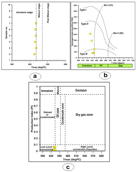 (a) Tmax values of the sample; (b) thermal maturation of the El Sebaiya samples, Nile Valley, Egypt [66]; (c) Tmax vs. production index (PI) values of the El Sebaiya samples, Nile Valley, Egypt (modified from [62]).