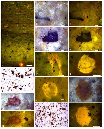 The organic matter consists of a variety of particles of different origin including Amorphous Organic Matter (AOM) spores and dinoflagellate (Figure 10). The organic geochemical analysis indicated that the samples contained kerogen type III and II based on the values of S2 and HI (Figure 8a,b). The microscopic composition of the organic matter, however, reveals the detailed composition of the organic matter, especially the diversity, abundances, thermal maturity, and intergranular distribution [65,66]. These aspects show large variations among the samples, indicating significant differences in the paleoenvironmental conditions. Samples no. 1 and 2 are composed mainly of thin laminae that vary between shale and fine silt with calcareous cement (Figure 11 (1–10) and Figure 12 (1,2). The organic matter is concentrated mainly in the shale laminae and is represented by alginite (41%) that is distinguished by its brown color in white light and bright yellow color in fluorescence mode (Figure 11 (1–3,6,7,11,12). The alginite extends in large sheets (<5 µm in thickness) parallel to the bedding plane (Figure 11 (1–3,6,7)). Some particles (10%) are similar to the observed alginite but lack the characteristic fluorescence. These particles have spherical lobes that could be relicts of algal cells (Figure 11 (8–10). Sheet-like particles lacking fluorescence but having cellular structure occurred in relatively large abundance (34%) (Figure 11 (4,5) and Figure 12 (13)). The sheets were observed in the kerogen extracts (Figure 12 (2)). Bituminite (9%) also occurred in significant amounts and was concentrated especially around alginite fragments (Figure 11 (4,5,10)). It showed light brown color in white light and yellow color in fluorescence mode. Vitrinite and inertinite (6%) particles concentrated only in the coarser silt laminae (Figure 11 (12,14). In the kerogen extracts, organic matter was dominated by flaky AOM of different densities and by transparent brown wood particles having a distinctive cellular tissue (Figure 11 (12,14) and Figure 12 (2)). The organic matter composition points to dysoxic conditions in the shale laminae. The density of the organic matter in the rock matrix is generally low and compares to the values of the TOC of samples no. 1 and no. 2 (Table 5). The kerogen type is mixed II/III, which is also in accordance with the organic geochemical analysis (Table 5).