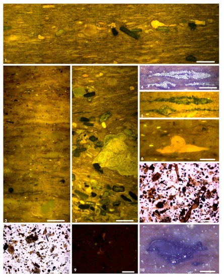 In sample no. 4, the alginite abundance was significantly lower (Figure 13 (1–3,6)). The main observation is the dominant occurrence of a bituminous groundmass. The bituminous groundmass had pale brownish shade in white light and strong yellow color in fluorescence mode (Figure 13 (1,2)). In transmitted light, the kerogen extract showed the dominance of the diffused edge AOM and low abundance of dinoflagellates that had a weak yellow fluorescence color (Figure 13 (3,4)). The AOM grains contained minute algal particles (1 µm) with yellow fluorescence. The dominance of bituminous groundmass in general indicates high level of paleoproductivity and anoxic conditions [68,69]. This is reflected in the high TOC and HI values of this sample (Table 5).