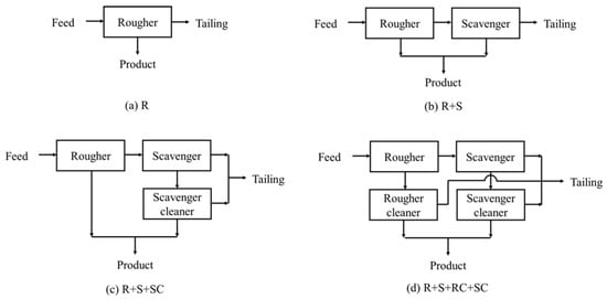 The flotation circuit design from the results (a) R: single-stage rougher flotation (b) R+S: rougher and scavenger flotation (c) R+S+SC: rougher, scavenger, and scavenger cleaner flotation (d) R+S+RC+SC: rougher, rougher cleaner, scavenger, and scavenger cleaner flotation.