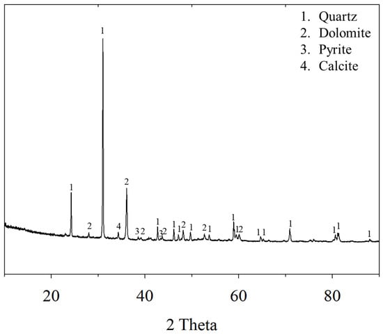 The sample ore from the Goldstrike mine mainly consisted of quartz, dolomite, and minor quantities of pyrite and calcite, as analyzed by X-ray diffraction (XRD) (Figure 2). Additional analysis was carried out to determine other element contents, which were not detected by XRD. Carbon and sulfur (by ELTRA, CS 2000, Haan, Germany), peroxide fusion, fire assay, and inductively coupled plasma-optical emission spectrometry (ICP-OES, PerkinElmer, MA, USA) analysis indicated that the sample contained gold, sulfur, and carbon as well as other elements (Table 1). In addition, the sample featured 252 ppm of As, 347 ppm of Cr, 165 ppm of Mn, 447 ppm of V, and 340 ppm of Zn and minor quantities (<100 ppm) of other elements.
