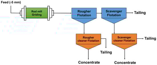 Rougher and scavenger flotations were performed followed by cleaner flotation for each concentrate (Figure 3). Rod mill (400 mm × 175 mm) grinding was carried out prior to flotation testing to reduce the particle size with 11 kg of various size rods for 10/15/20 min at 33 wt.% solids. The Denver laboratory flotation machine performed all the flotation tests. Kerosene (>99%, Fisher Chemical™, Hampton, USA) and methyl isobutyl carbinol (MIBC) (4-Methyl-2-pentanol, 98%, Sigma-Aldrich, Saint Louis, USA) were selected as the collector and frother, respectively.