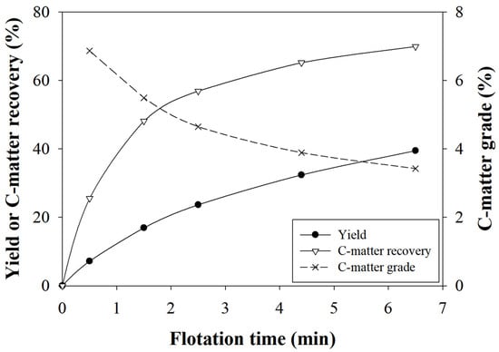 The purpose of the rougher flotation was high C-matter recovery; thus, Test 10 was selected as the optimal conditions for rougher flotation, as this test corresponded to maximum recovery (69.87%), with a high C-matter grade (3.42%) in the rougher concentrate. Test 11 also resulted in high recovery (70.09%) with high grade (3.62%); however, the difference in recovery and grade was insignificant and Test 10 was chosen as it used a lower MIBC dosage (120 g/t). Figure 4 describes the flotation results again with yield and grade; both the C-matter recovery and yield increased together with the increased flotation time, but after 2.5 min, the increased C-matter recovery began to plateau, while the yield continued to increase. Above this point, further improvement in selectivity was not possible. Thus, the flotation time for the rougher flotation was limited to 2.5 min for subsequent test work.