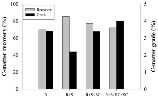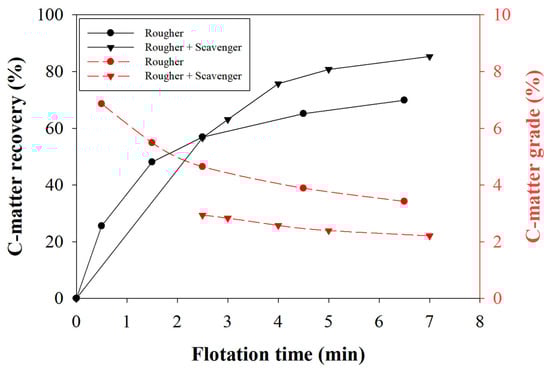Although the influence of the reagent dosage on the recovery in the scavenger was weaker than in the rougher flotation, the scavenger helped to collect more C-matter than with a single rougher flotation stage (Figure 5). The additional kerosene and the longer conditioning time likely increased the hydrophobicity of slow-floating middling particles, increasing their floatability. The selected test results for the highest recovery in the scavenger are presented in Figure 5, along with the rougher results; however, the C-matter grade was much reduced by the scavenger flotation. This resulted from the collected higher grade matter in the rougher stage and the greater entrainment in the scavenger stage.