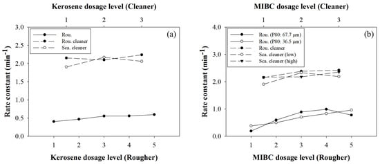 Rate constant changes by (a) kerosene dosage level (b) MIBC dosage level in rougher and cleaner flotation (sca. cleaner (low): with low dosage of kerosene, 42 g t−1 and sca. cleaner (high): with high dosage of kerosene, 125 g t−1 in scavenger cleaner) obtained by the classical first order model (R2 > 0.96).