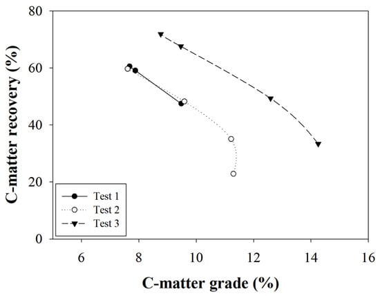In this study, the cleaner flotation was effective for the further improvement of the selectivity. In a simulation study, conducted by Honaker and Mohanty, on column flotation for fine coal cleaning, it was shown that the efficacy of the cleaner stage depends on the non-selective detachment conditions and the collected amount of middling []. Thus, the scavenger flotation may help to collect more C-matter, which was detached during the rougher stage. However, the scavenger flotation collected middling as well, leading to reduced grade. Improved selectivity in the scavenger cleaner flotation stage indicated that the more middling and gangue were collected as scavenger concentrate; middling and gangue were rejected in the cleaner stage.