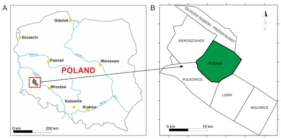 Location of the Cu-Ag deposits of the Legnica-Głogów Copper District against the background of Poland (A). Location of the boundaries of the Rudna deposit against the background of developed copper ore deposits in the Fore-Sudetic Monocline (B).