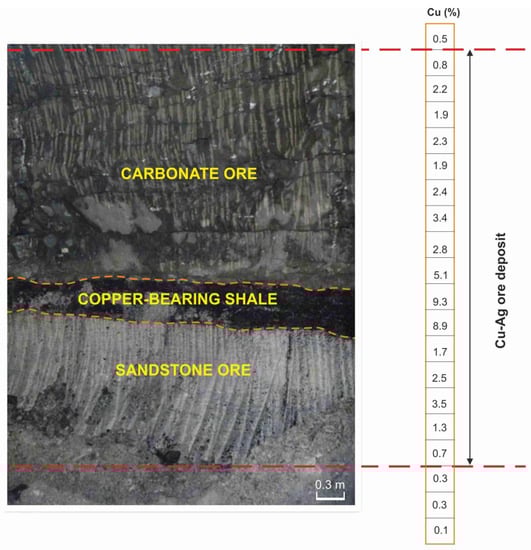 The abundances of Cu and accompanying elements in the main lithological units are variable. The abundances of Cu and Co dominate in the sandstone ore, while the abundances of Ni, Pb, and V in the Kupfershefer ore (Table 2), despite the small share of this ore in the resources (6%).