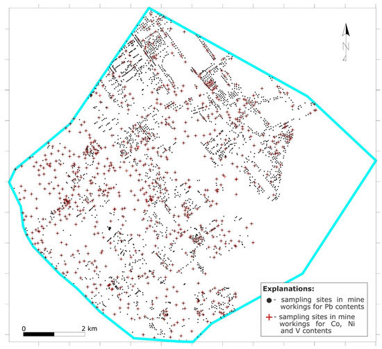 In the Rudna deposit, the average distance between the sampling sites used to determine the basic element (Cu) is approximately 40 m. The sampling pattern for the accompanying elements is much less frequent, with an average sample spacing of approximately 180 m for Pb to approximately 400 m for Co, Ni, and V (Figure 4). For this reason, the size of the data set for Cu was much considerably larger than for the accompanying elements and was 10,243 versus 3255 for Pb, 732 for Co, 722 for Ni, and 676 for V (Table 2).