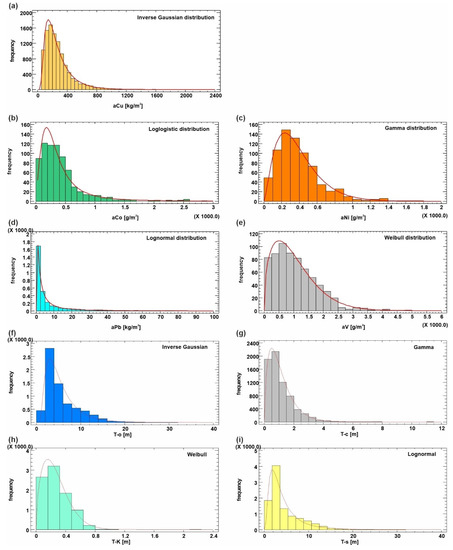Histograms and optimal theoretical distributions of metal abundance (aCu, aCo, aNi, aPb, and aV (a–e)) and thickness for fitted to empirical distributions according to the log-likelihood statistic (Explanations: (f): (T-o)—thickness of ore deposit, (g): (T-c)—the carbonate ore, (h): (T-K)—the Kupferschiefer ore, (i): (T-s)—sandstone ore); K-S Test—Kolmogorov-Smirnov test of the consistency of the empirical distribution with the assumed theoretical distribution, p-value ≤ 0.05—rejection of the hypothesis on the consistency of the empirical distribution with the assumed theoretical distribution for significance level 0.05, p-value > 0.05—there are no grounds to reject the hypothesis that the empirical distribution is compatible with the assumed theoretical distribution.