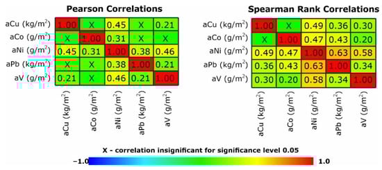 The Pearson correlation coefficients and Spearman’s rank correlation coefficients between the abundances of the primary variable (Cu) and the secondary variables (Pb, Ni, V, Ag, Co) are shown in Figure 6. In general, the abundance of correlations between the Cu abundance and the abundance of accompanying elements are weak (with correlation coefficients <0.5) and for some pairs of variables, statistically insignificant (for significance level 0.05). Therefore, it can be assumed that the use of more advanced geostatistical methods taking into account auxiliary variables (e.g., collocated cokriging [49], regression kriging [50]) will only contribute to increasing the accuracy of the estimates of the accompanying elements resources to a limited extent.