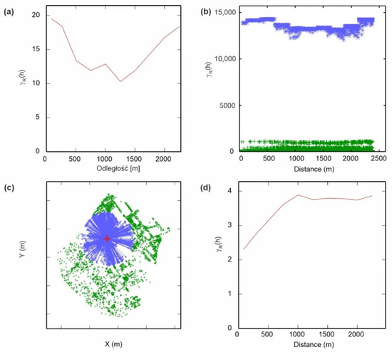 Variogram of Pb abundance before removing the outlier (a). Variogram cloud (b). Location of sampling points (c). Variogram of the Pb abundance after removing the outlier (d). Explanations: the values of the variogram related to the outlier value of Pb abundance (b) and the pairs of sampling points included in their calculation (c) are marked in blue; other values of the variogram (b) and the sampling points included in their calculation (c) are marked in green; red color—outlier of the Pb abundance (c).