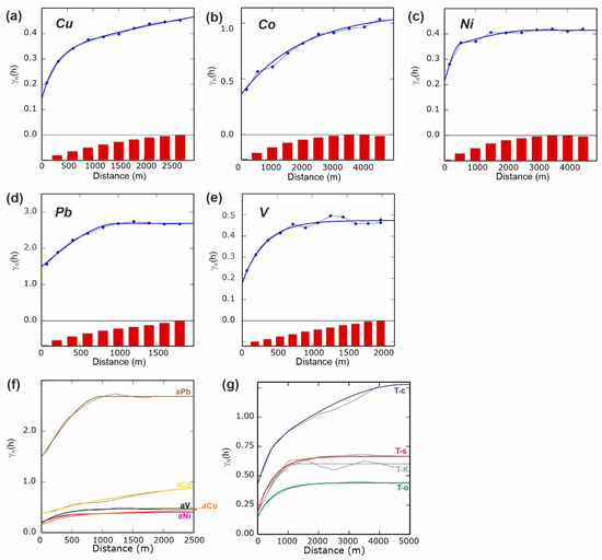 (a–e) Relative variograms (points) and their theoretical models (solid lines) of the Cu abundance and the abundance of accompanying elements in the Cu-Ag deposit; (f) Comparison of relative variograms and their theoretical models in one scale; (g) Comparison of relative variograms and their theoretical models of the thickness of ore deposit (T-o) and three basic lithological series (T-c—the carbonate ore, T-K—the Kupferschiefer ore, T-s—sandstone ore).