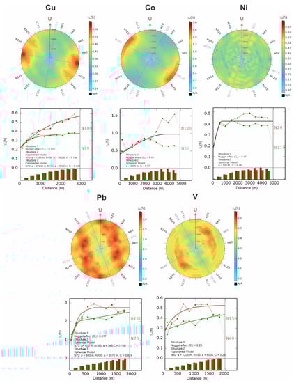 The equations of the theoretical models (exponential and spherical) fitted to the relative variograms of the deposit parameters (the thickness and the abundance of elements) are presented in Table 4 and their graphs in Figure 8. In the case of Co, Pb, and V abundance, simple models were fitted, while for Cu and Ni abundance, nested models were applied.