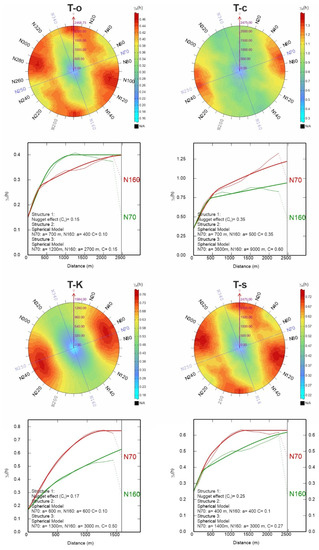 Maps of relative directional variograms of deposit thickness and variograms for the directions of minimum (green lines) and maximum (red lines) variability approximated by theoretical models (the anisotropy direction were measured in degrees clock-wise from the North; T-o—thickness of ore deposit, T-c— the carbonate ore, T-K—the Kupferschiefer ore, T-s—sandstone ore).