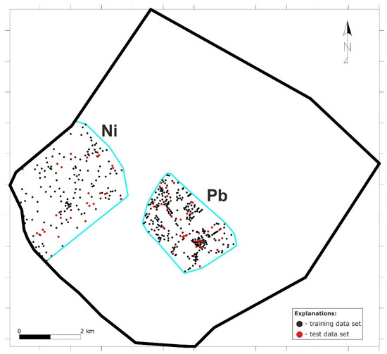 The prediction of Ni and Pb abundance at the test sampling points was performed using ordinary kriging (OK) and lognormal ordinary kriging (LOK). Accuracy assessment was based on a comparison of the predicted abundance with the real abundance in the test set. The reason for choosing Ni and Pb abundance was the extreme difference in their variability as shown by the coefficient of variation (CV): the highest in the case of Pb abundance (CV = 166%) and the lowest in the case of Ni abundance (CV = 65%) (Table 3). The basis of the test procedure consisted of 182 measurements of Ni abundance and 321 measurements of Pb abundance (in separate parts of the deposit, respectively, with an area of 9.4 km2 and 8 km2) (Figure 11). The average distance between neighboring test points was about 240 m for Ni and 170 m for Pb.